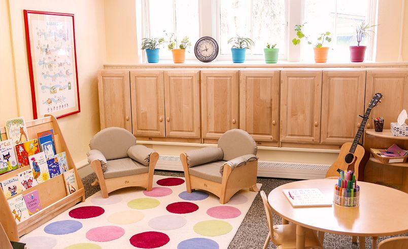 - A display of children’s paintings around the room showcases children’s art and is a tremendous self-esteem booster