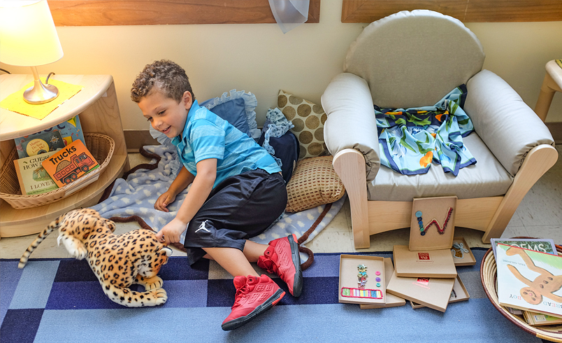 Soft spots are wonderful places to read with children or simply to have a conversation. Children who are in group care for many hours of the day need some down time. This is not always easy to come by in a group setting, so any way the environment can be manipulated to include quieter places is a tremendous benefit to young children.