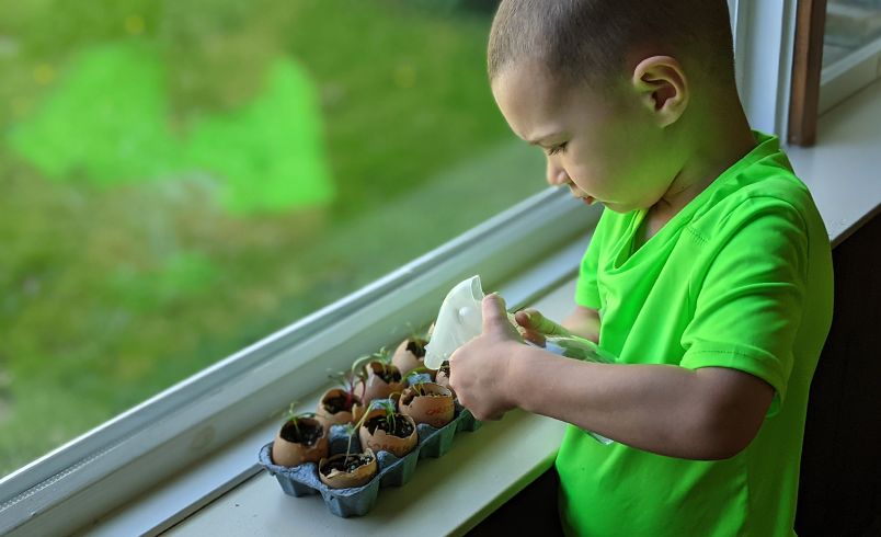 Materials: eggs, egg carton, potting soil, seeds, spray bottle for water