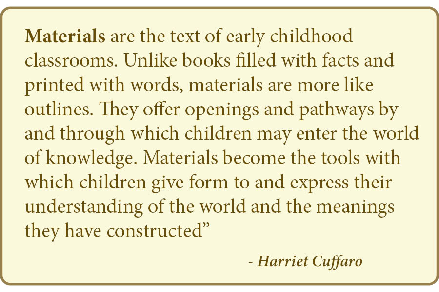 Educators from Reggio Emilia speak of the hundred languages of materials that can develop over time when placed in the environment. Vygotsky suggested that the types of materials chosen facilitate the development of higher mental processes. How the materials are used, who is using the materials, where they are placed, and when they are offered, are essential questions to ask. Most important, perhaps, is the question, “why these specific materials?”.